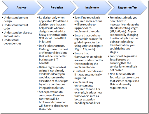 It doesn’t have to be an overkill methodology. What you need is some concise steps which sets in stone the approach to follow when transforming a service from your existing platforms (i.e. 10g or other legacy) into your target solution. Purpose of the method is to ensure that all transformation activities are occurring following a consistent method and using the same set of guidelines and standards.